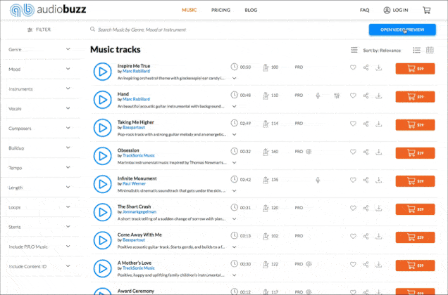 Check out our Video Preview tool!Upload your video instantly and match it with selected tracks in real-time to find the right music faster. An Industry first. Only on Audio Buzz. |